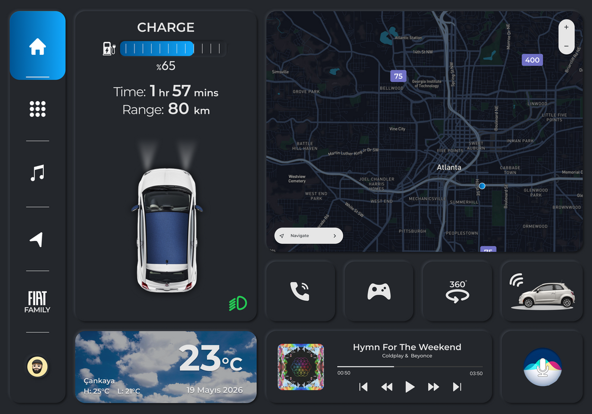 Over a period of 5 months, I collaborated with the Tofaş GUI team on my graduation project. The project focuses on crafting interface designs for electric micromobility cars equipped with advanced driver-assistance systems, targeting the 16-24 age group.